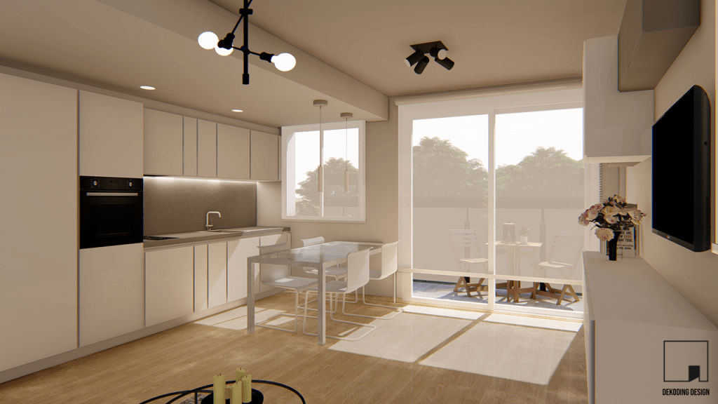 Siendo la propietaria más bien una amante del deporte y de la naturaleza que de las artes culinarias, diseñamos una cocina muy minimalista que se funde con el resto del espacio. Para conseguirlo, aprovechamos la pared entre columna y ventana creando una sola línea, con electrodomésticos integrados, muebles en acabado blanco brillo (a juego con el mueble de la televisión) y una encimera y salpicadero de cuarzo gris.