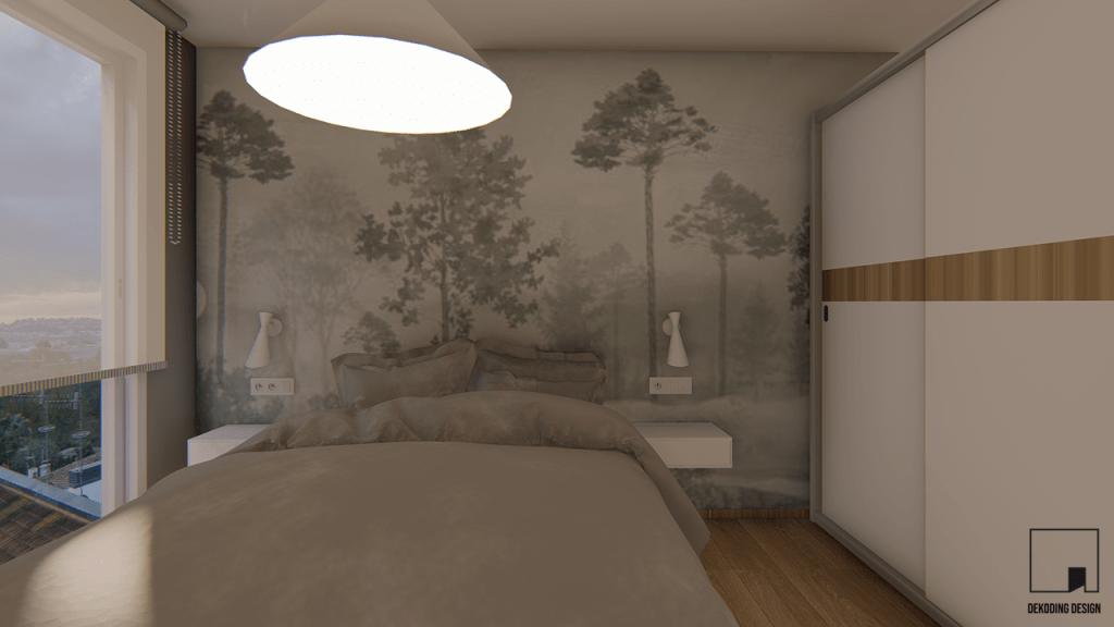 Separado del resto, el dormitorio se concibió como un lugar escondido e inspirado en el bosque. En el mismo destacan el suelo de madera y el mural textil (que hace la función de cabecero).